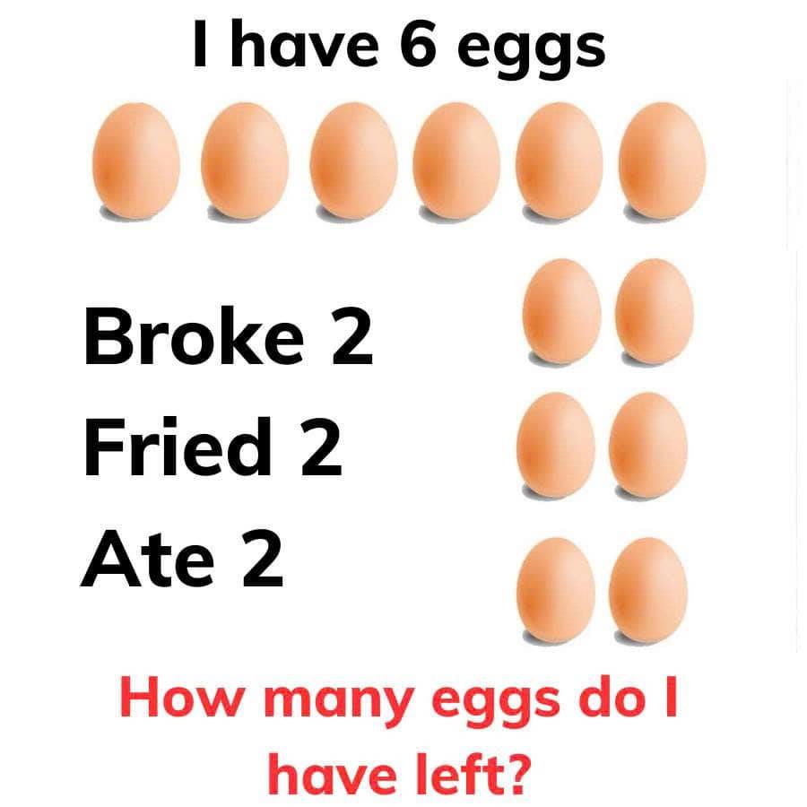 Peut être une image de jaune d’œuf et texte qui dit ’I have 6 eggs Broke 2 Fried 2 Ate 2 How many eggs do I have left?’