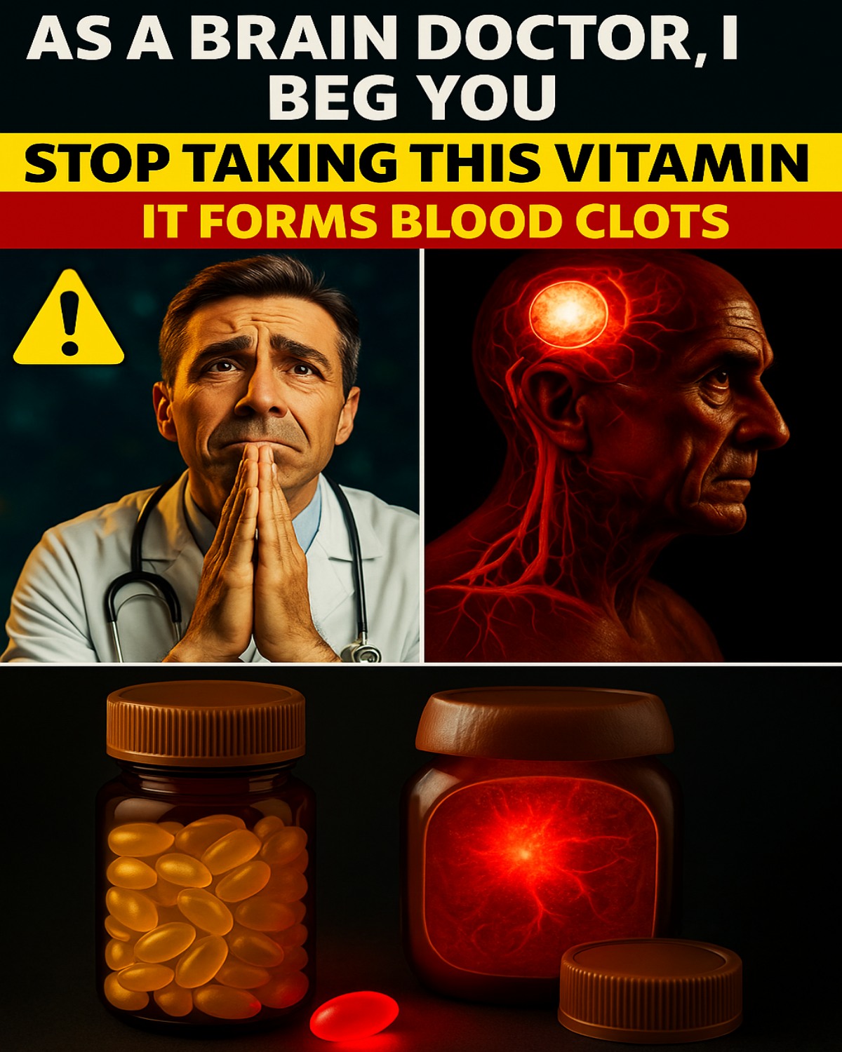 The headline, “As a Brain Doctor, I Beg You: Stop Taking This Vitamin — It Forms Blood Clots,” is intentionally crafted to shock the viewer. The design relies on vivid colors, emotional expressions, and ominous symbols to create a sense of urgency and fear. Yet, despite the bold claim, the image offers no scientific explanation, no specific vitamin, and no verifiable medical references. This raises an essential question: why do such messages gain widespread attention, and why are they potentially harmful?